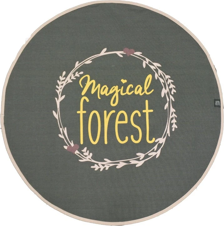 Dit ronde vloerkleed behoort tot de Magical Forest kinderkamercollectie van Factory Petite. Het is gemaakt van canvas waardoor je het gemakkelijk op de hand kunt wassen. Dat is wel zo handig voor in de kinderkamer! Het vloerkleed is uitgevoerd in de kleur zwart. Op het kleed staat de tekst Magical Forest omgeven door een bladerkrans. Om te voorkomen dat het kleed snel verschuift, heeft het een antislip bodem. Dat maakt het vloerkleed extra prettig om op te spelen!