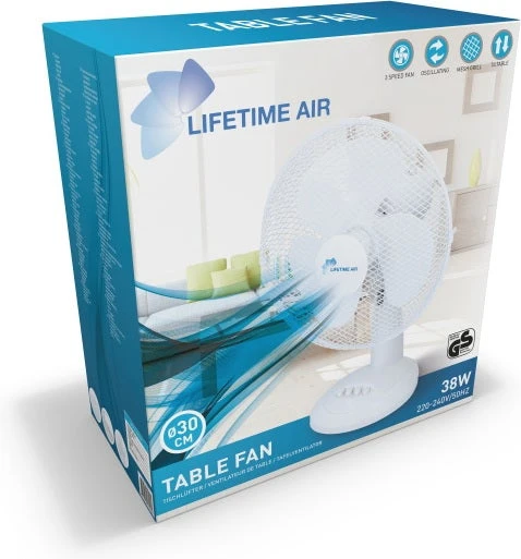 De Lifetime Air tafelventilator is een middelgrote, stijlvolle tafelventilator. Deze ventilator is wit, heeft 3 snelheden en een maximaal vermogen van 38 Watt. De afmetingen van de ventilator zijn 34,7 x 33,5 x 49 cm.